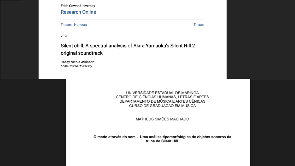 1. Atkinson, C. N. (2020). Silent chill: A spectral analysis of Akira Yamaoka’s Silent Hill 2 original soundtrack. Edith Cowan University. https://ro.ecu.edu.au/theses_hons/1554